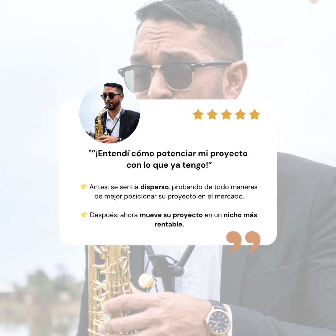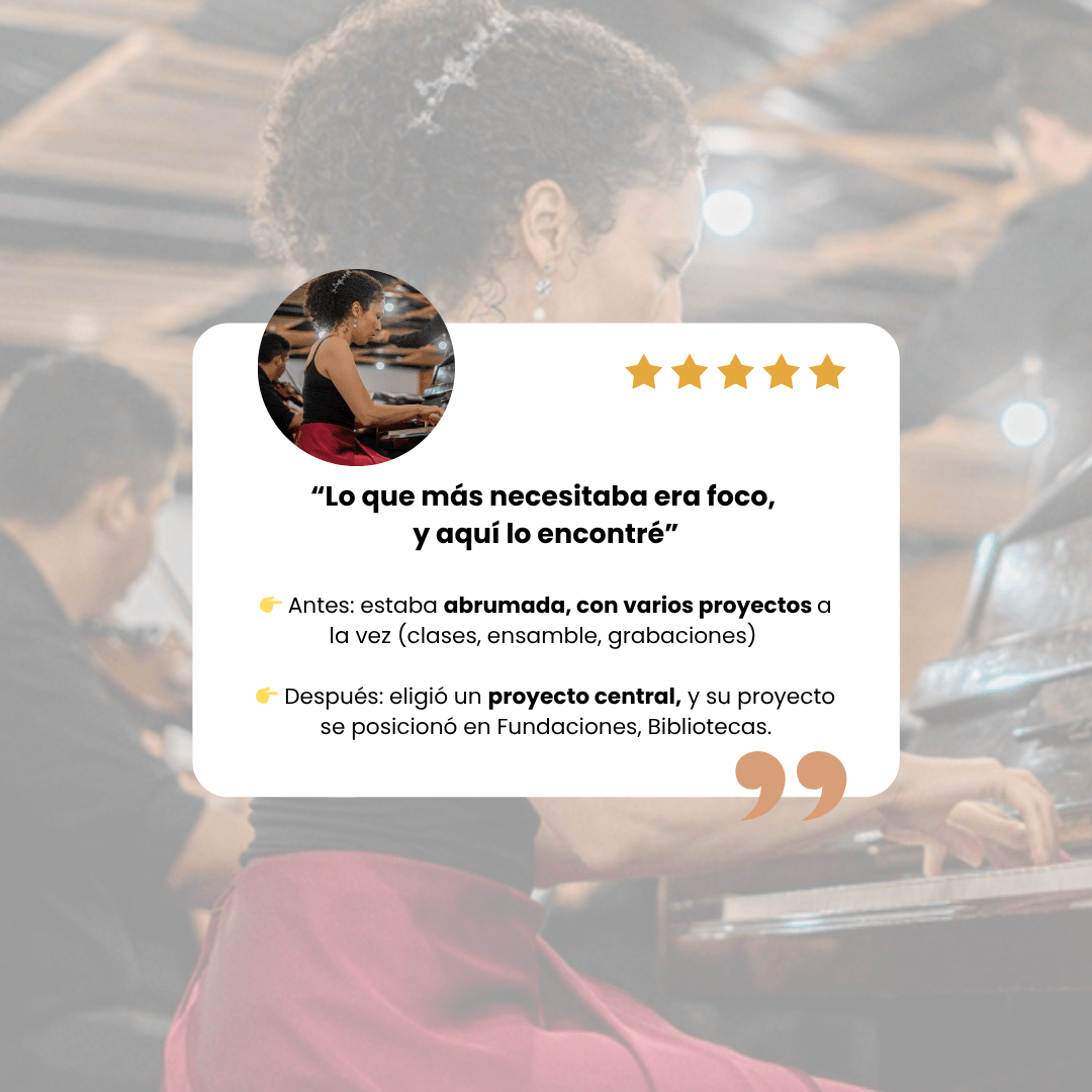 Funciona para ambos. He trabajado con docentes que querían lanzar cursos online, academias o talleres, y con músicos que buscaban visibilidad para su ensamble o proyecto artístico. La clave es que tu proyecto ya exista en alguna forma, y lo que haremos es darle estructura, estrategia y un plan de monetización adaptado.